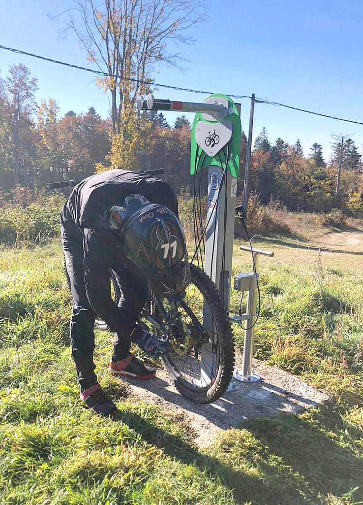 Équipée d'un support central, cette station permet de suspendre facilement le vélo par la selle, facilitant ainsi l'accès aux différentes mécaniques.