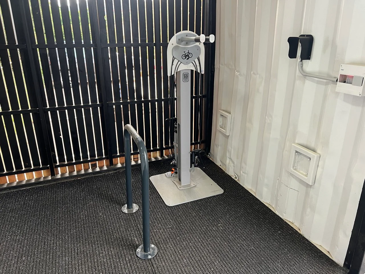 Des pictogrammes et logos explicatifs sont intégrés à la station pour guider l’utilisateur sur le positionnement du vélo, l’usage des supports et le fonctionnement de la pompe. Cela rend l’utilisation intuitive et sécurisée, sans nécessiter d’explications supplémentaires.